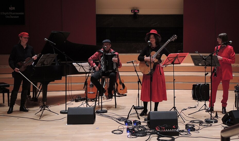 In Abänderung des Programms spielte anstelle des Ensembles A Mekhaye anlässlich des Weltfriedenstages ein gemischtes Ensemble mit Anna Vishnevska, Gesang und Gitarre, Stefan Goreiski, Akkordeon, Silke Wegerich, Harfe und Gesang sowie Christine Keil, Akkordeon Friedenslieder und Melodien aus unterschiedlichen Kulturen.