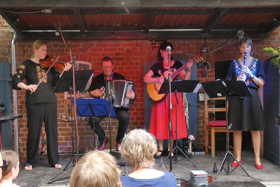 In Abänderung des Programms spielte anstelle des Ensembles A Mekhaye anlässlich des Weltfriedenstages ein gemischtes Ensemble mit Anna Vishnevska, Gesang und Gitarre, Stefan Goreiski, Akkordeon, Silke Wegerich, Harfe und Gesang sowie Christine Keil, Akkordeon Friedenslieder und Melodien aus unterschiedlichen Kulturen.